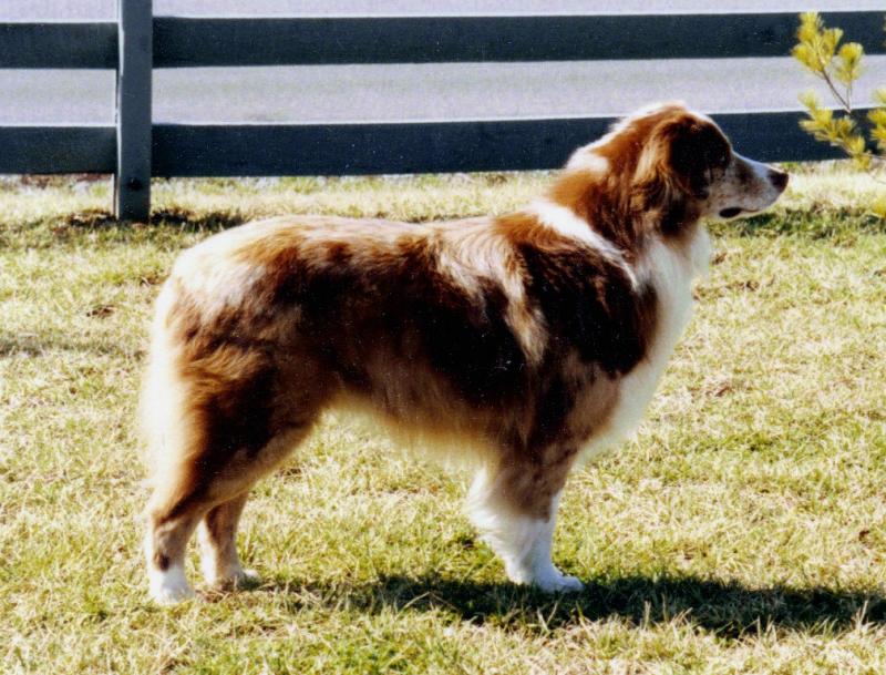 A striking red merle dog with beautiful conformation.