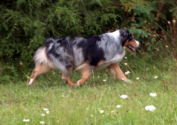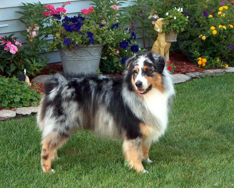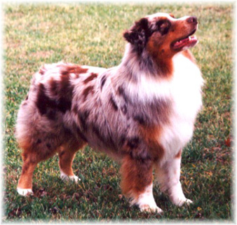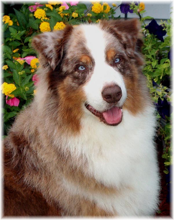 A striking red merle dog with beautiful conformation.